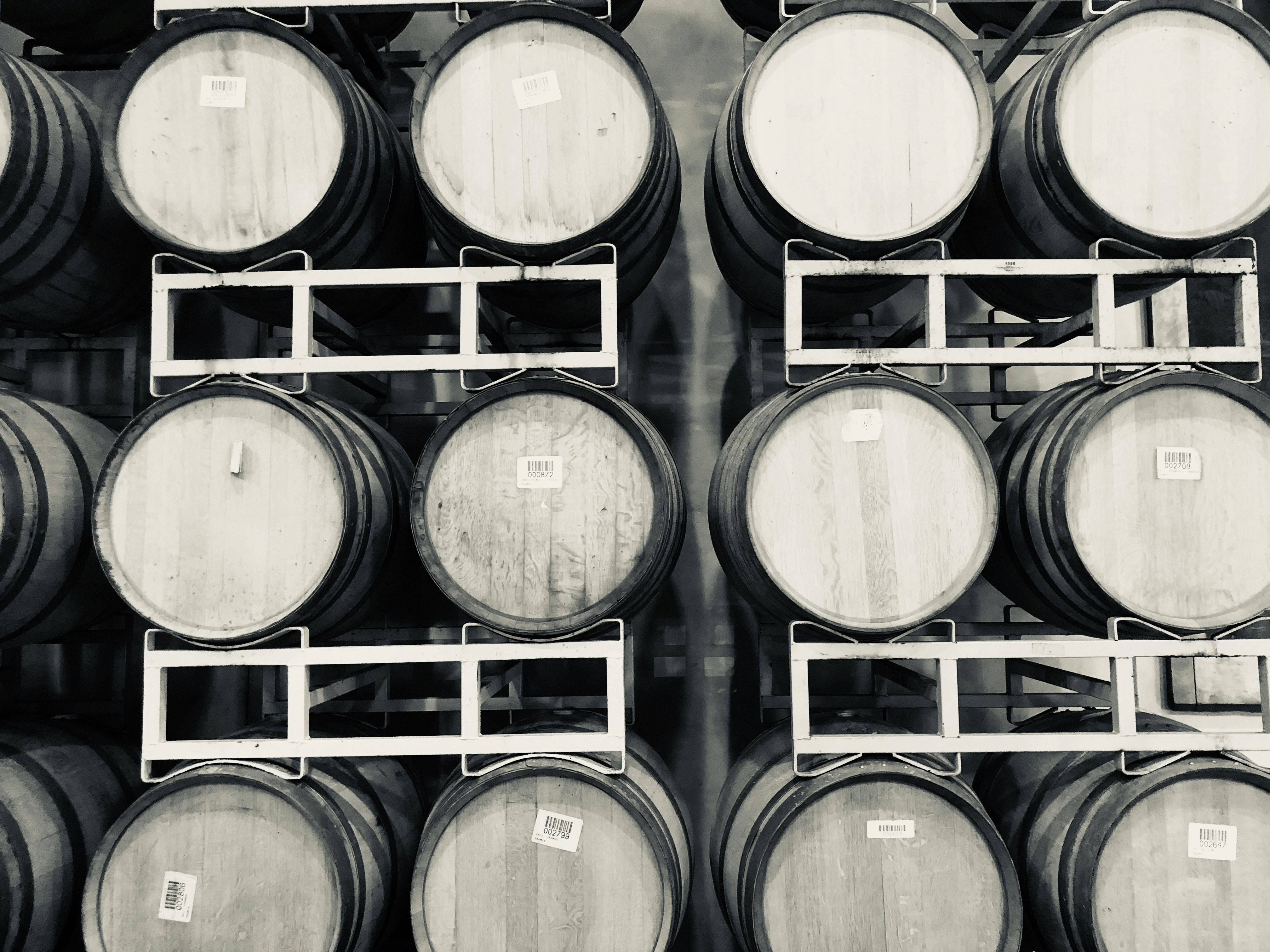 Oil barrels stacked in industrial warehouse with quality control labels